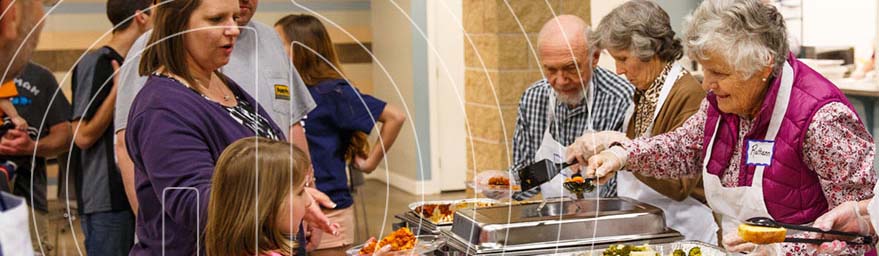 Retirees are volunteering and serving food to a little girl with Garden Spot Village Logo over the photo.