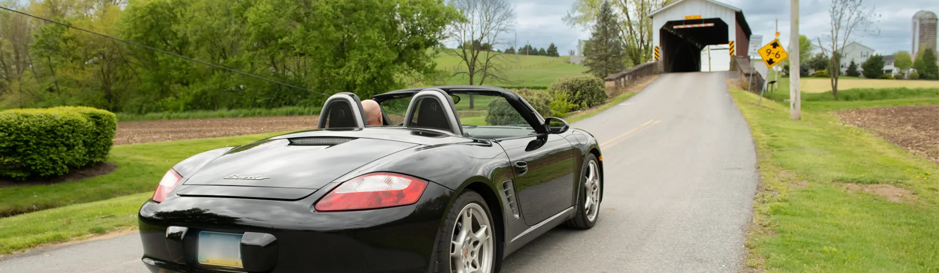 a black porsche boxster is driving down a country road